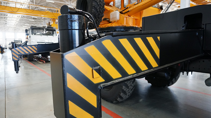 - Boom: 3 sections telescopic. Boom telescoping is performed with hydraulic cylinder and block-and-tackle system. Made of 10XCND or S700MC steel. In order to increase a length of the boom a 9.0m jib to be equipped parallel to the boom or at an angle of 30 degrees