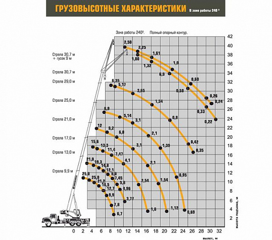 - Boom: 4 sections telescopic. Boom telescoping is performed with hydraulic cylinder and block-and-tackle system. Made of S700MC steel. In order to increase a length of the boom the 9.0m jib to be equipped parallel to the boom or at an angle of 30 degrees