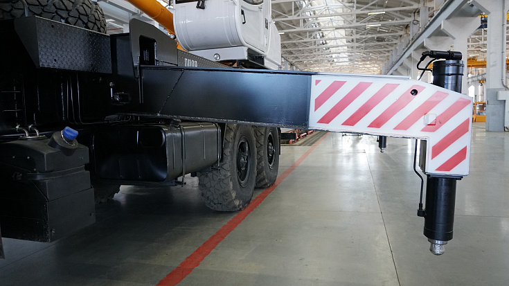 - Boom: 4 sections telescopic. Boom telescoping is performed with hydraulic cylinder and block-and-tackle system. Made of S700MC steel. In order to increase a length of the boom the 9.0m jib to be equipped parallel to the boom or at an angle of 30 degrees