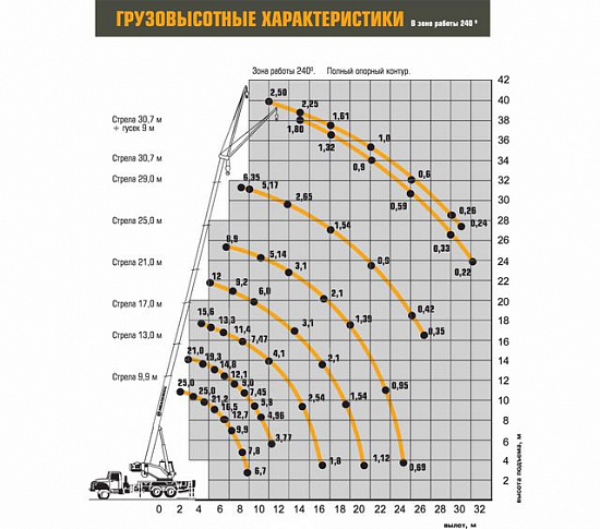 - Boom: 4 sections telescopic. Boom telescoping is performed with hydraulic cylinder and block-and-tackle system. Made of S700MC steel. In order to increase a length of the boom the 9.0m jib to be equipped parallel to the boom or at an angle of 30 degrees