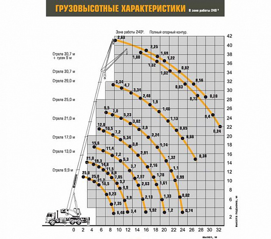 - Boom: 4 sections telescopic. Boom telescoping is performed with hydraulic cylinder and block-and-tackle system. Made of S700MC steel. In order to increase a length of the boom the 9.0m jib to be equipped parallel to the boom or at an angle of 30 degrees