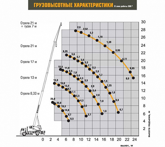 - Boom: 4 sections telescopic. Boom telescoping is performed with hydraulic cylinder and block-and-tackle system. In order to increase the boom length a 7.0 m jib to be equipped