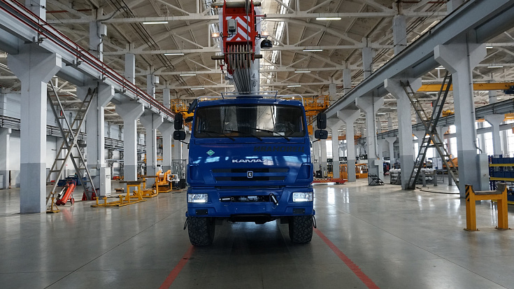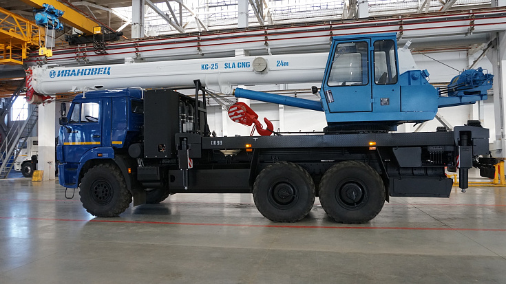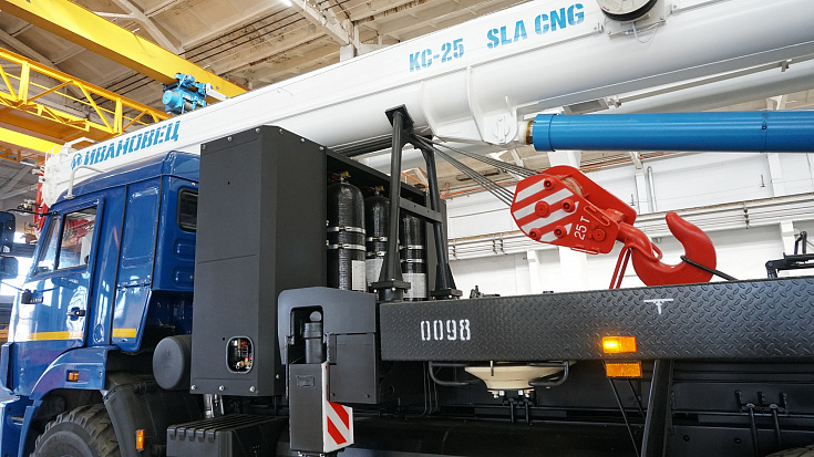 The truck crane is mounted on the gas-engine chassis KAMAZ-43118 that uses CNG (compressed natural gas) (compressed methane) as fuel. The system of cylinders placed on the truck crane allows filling 1120 liters of gas fuel. Due to this, it is possible to travel up to 500 km or 24 hours of continuous operation.